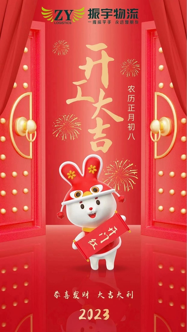 振宇物流集團将於2023年1月29日(正月初八)正式開工,全體員工已迅速進入工作崗位,所有車輛整裝待發。在新的一年裏将以嶄新的面貌繼續爲您提供優質的物流與供應鏈服務,歡迎廣大客戶朋友提前做好收發貨安排。