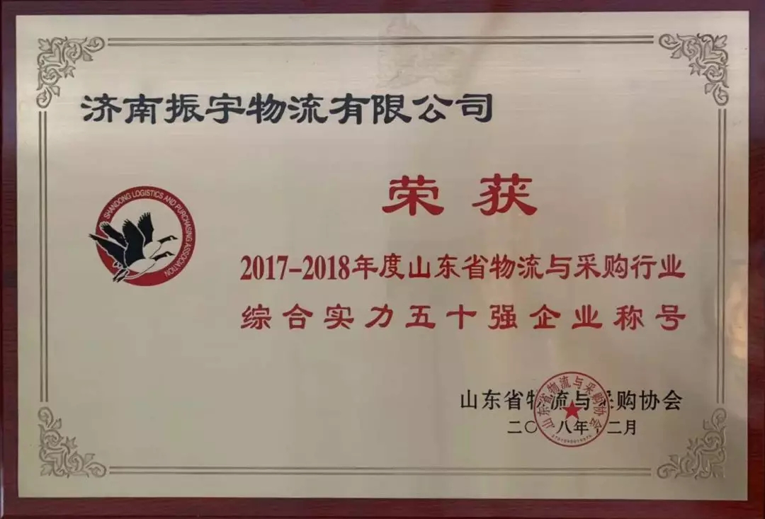 振宇物流經山東(dōng)省物流與採(cǎi)購協會綜合評審,榮獲2017-2018年度山東(dōng)省物流與採(cǎi)購(gòu)行業綜合實力五十強企業稱(chēng)号。