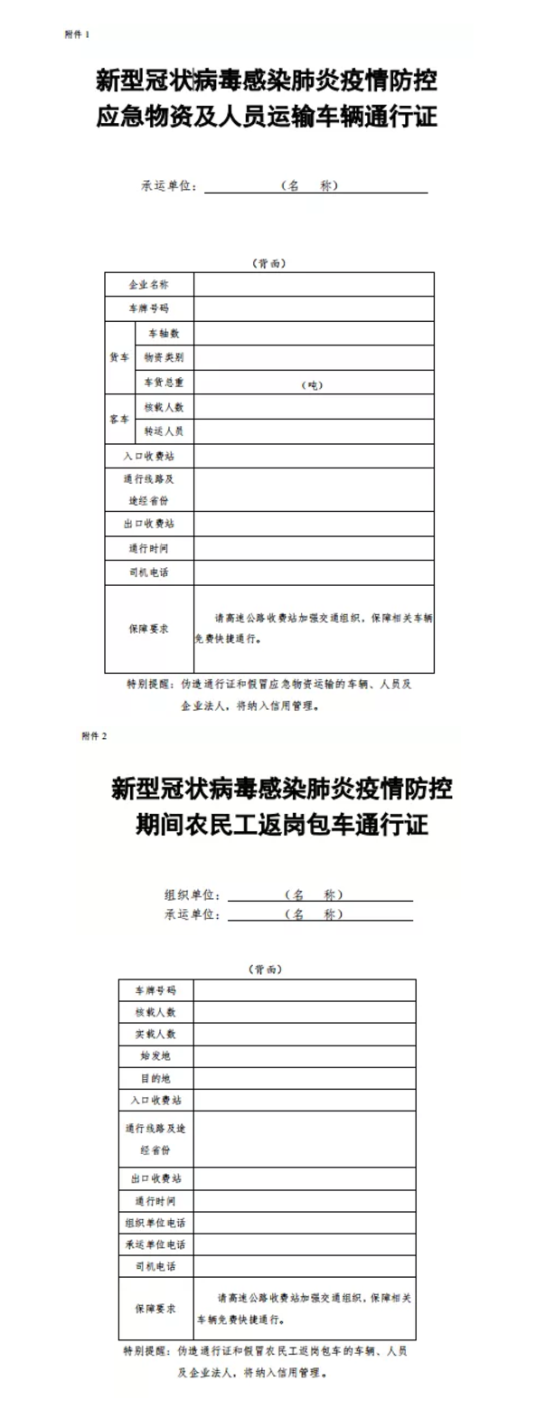 通知要求,地方各級交通運輸部門要認真落實《交通運輸部關於(yú)切實保障疫情防控應急物資運輸車輛順暢通行的緊急通知》和《交通運輸部關於(yú)疫情防控期間免收農民工返崗包車公路通行費的通知》要求,切實簡化“新型冠狀病毒感染肺炎疫情防控應急物資及人員運輸車輛通行證”(簡稱“車輛通行證”)、“新型冠狀病毒感染肺炎疫情防控期間農民工返崗包車通行證”(簡稱“包車通行證”)辦(bàn)理流程,通過政府網站、微信、電子郵件等便捷方式提供“車輛通行證”“包車通行證”統一式樣,供承運單位或駕駛人在本地自行打印、自行填寫。