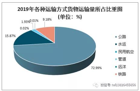 從貨物運輸的方式拉看,公路運輸仍然占據著(zhe)我國貨物運輸行業的主導地位。2019年各種貨運運輸量中公路運輸量占比最大,達到瞭(le)72.99%;其次爲水運,占比爲15.87%;鐵路運輸量占比9.18%,位居第三。我國民航運輸業起步較晚,仍處於發展階段,貨機數量整體來說相對較少,這導緻2019年民航貨運量占比僅有0.02%。