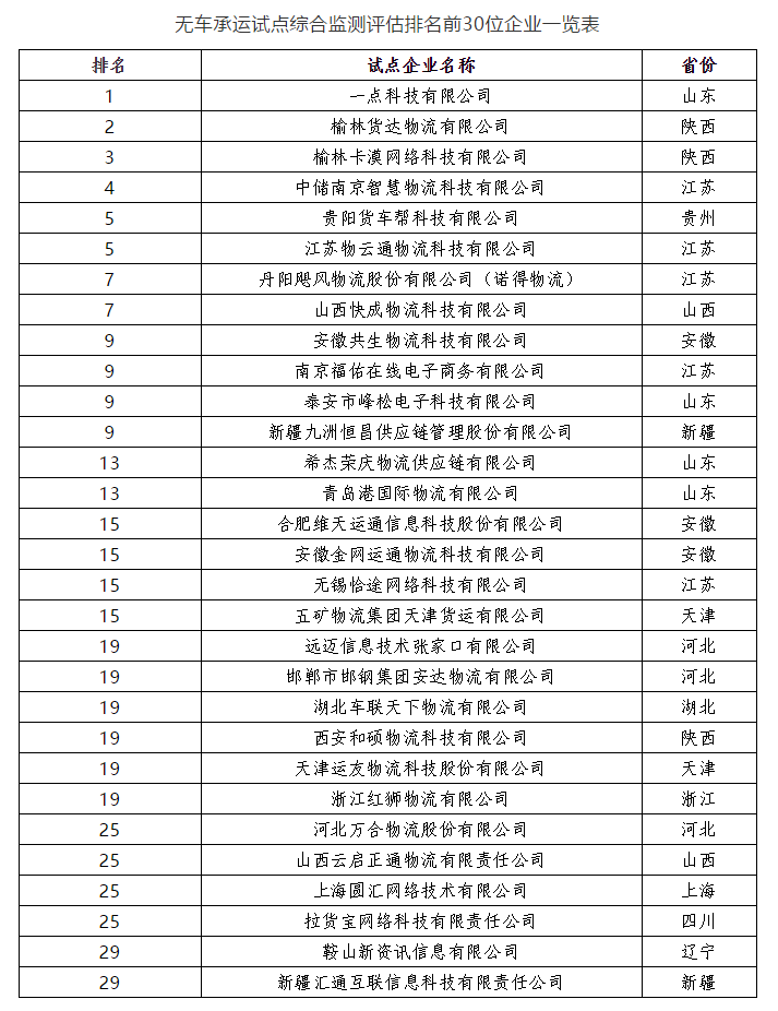 無車(chē)試點(diǎn)排名前30的,50%以上都是跟大宗運輸相關