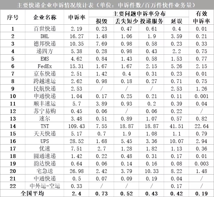 全國快遞(dì)企業申訴率(百萬件快件業務量)平均爲2.40,有效申訴率平均爲0.19。用戶對(duì)快遞(dì)企業申訴主要問題中,快件損毀申訴率平均爲0.73,快件丢失短少申訴率平均爲0.52,投遞(dì)服務申訴率平均爲0.43,快件延誤申訴率平均爲0.42。