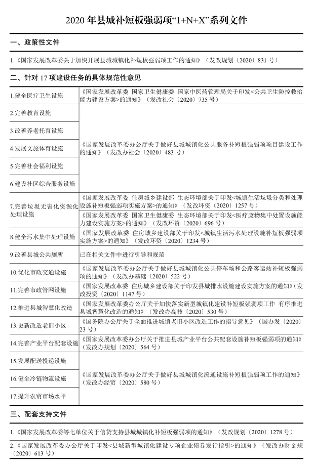 2020年5月29日,國家發展改革委印發《關於(yú)加快開展縣城城鎮化補(bǔ)短闆強弱項工作的通知》,聚焦縣城及縣級市城區,兼顧鎮區常住人口10萬以上的非縣級政府駐地特大鎮、2015年以來“縣改區”“市改區”形成的地級及以上城市市轄區,将公共服務設施、環境衛生設施、市政公用設施、産業培育設施4大領域共17項建設任務作爲建設重點,明確(què)瞭(le)總體要求、主要任務、要素保障和組織實施方式,公布瞭(le)縣城城鎮化補短闆強弱項項目範疇和縣城新型城鎮化建設示範地區名單。