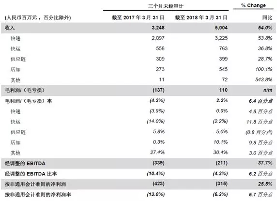5月10日,百世集團公布2018年第一季度未經審計财務業績(jī):一季度總收入50.04億元人民币,同比增長(zhǎng)54%;毛利潤1.1億元人民币,與去年同期相比提升6.4%。