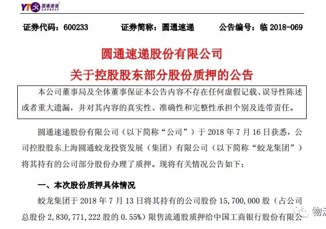 發(fā)布者:振宇物流 發(fā)布時間(jiān):2018-07-18 09:05:48 7月17日,圓通速遞發布關於(yú)控股股東部分股份質押的公告。公告顯示,公司控股股東上海圓通蛟龍投資發展(集團)有限公司(以下簡稱“蛟龍集團”)将其持有的公司部分股份辦理瞭(le)質押。