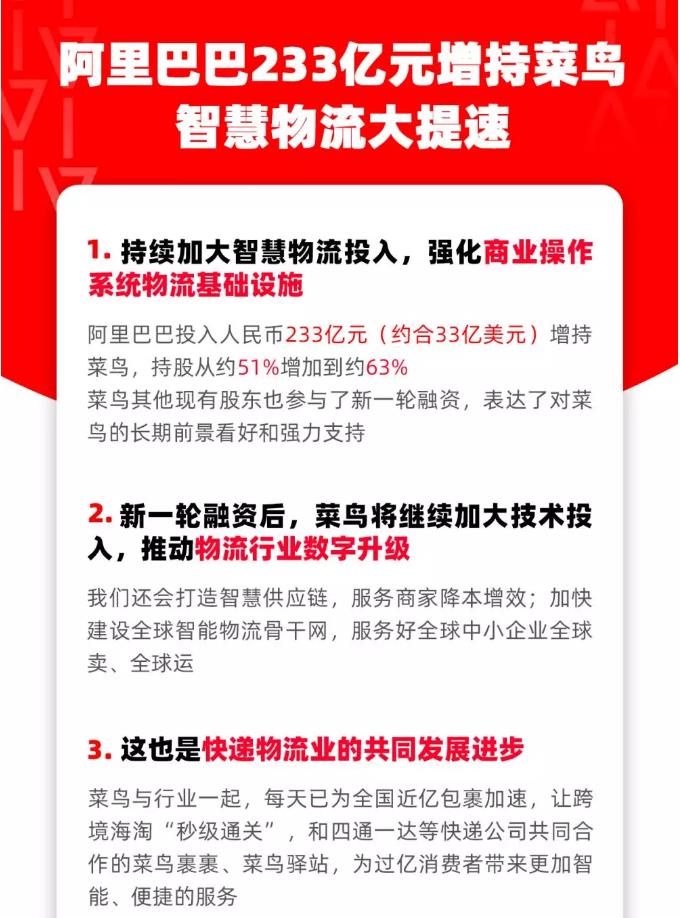 阿裏(lǐ)巴巴集團11月8日宣布,爲持續加大智慧物流投入,強化商業操作系統物流基礎(chǔ)設施,已領銜完成對(duì)菜鳥網絡新一輪增資。阿裏巴巴通過增資和購(gòu)買老股的方式,投入人民币233億元(約合33億美元),持有菜鳥股權從約51%增加到約63%。菜鳥其他現有股東也參(cān)與瞭(le)新一輪融資,表達瞭(le)對菜鳥(niǎo)的長(zhǎng)期前景看好和強力支持。